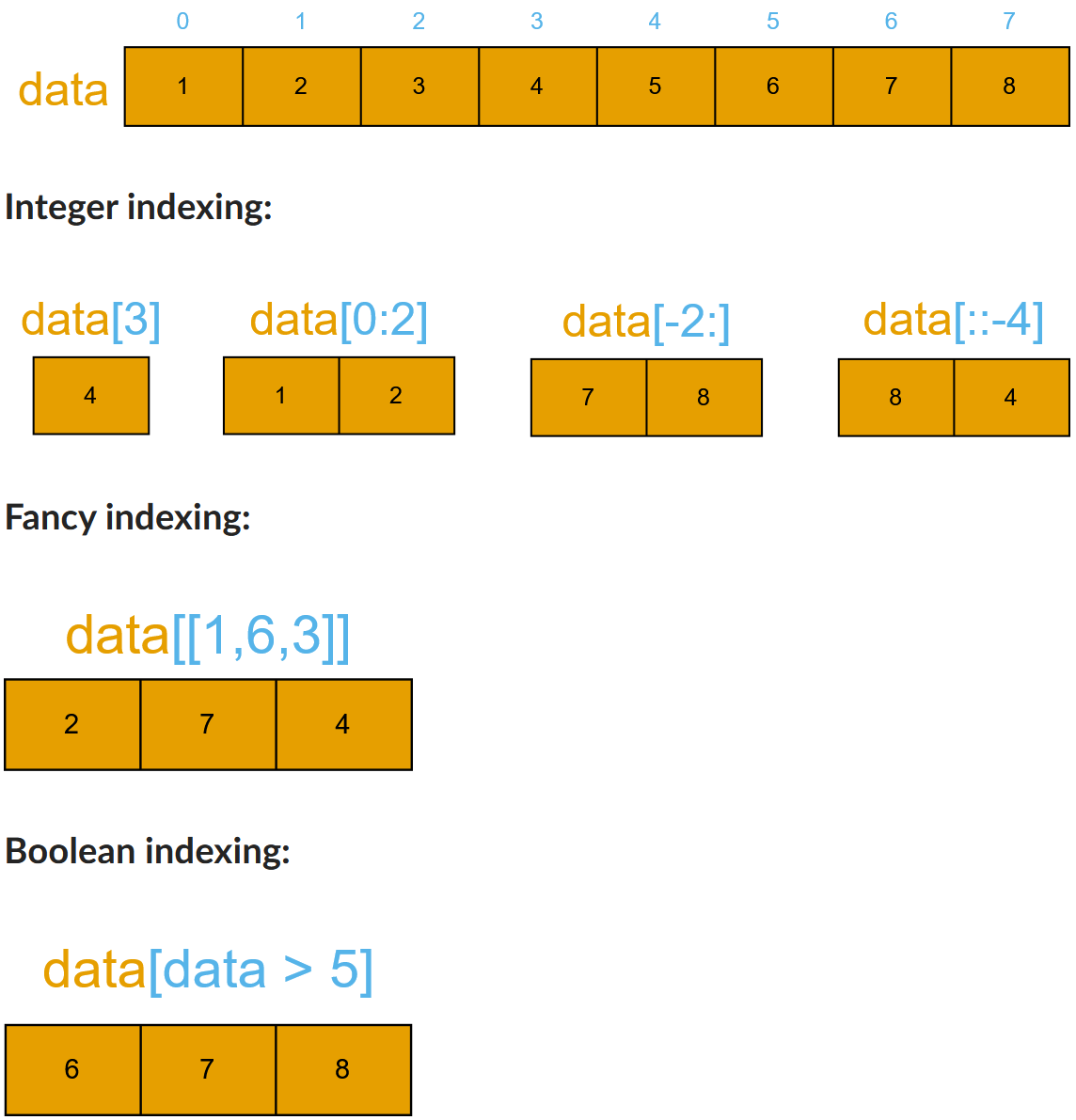 Basic indexing is similar to Python lists. Note that advanced indexing creates copies of arrays.
